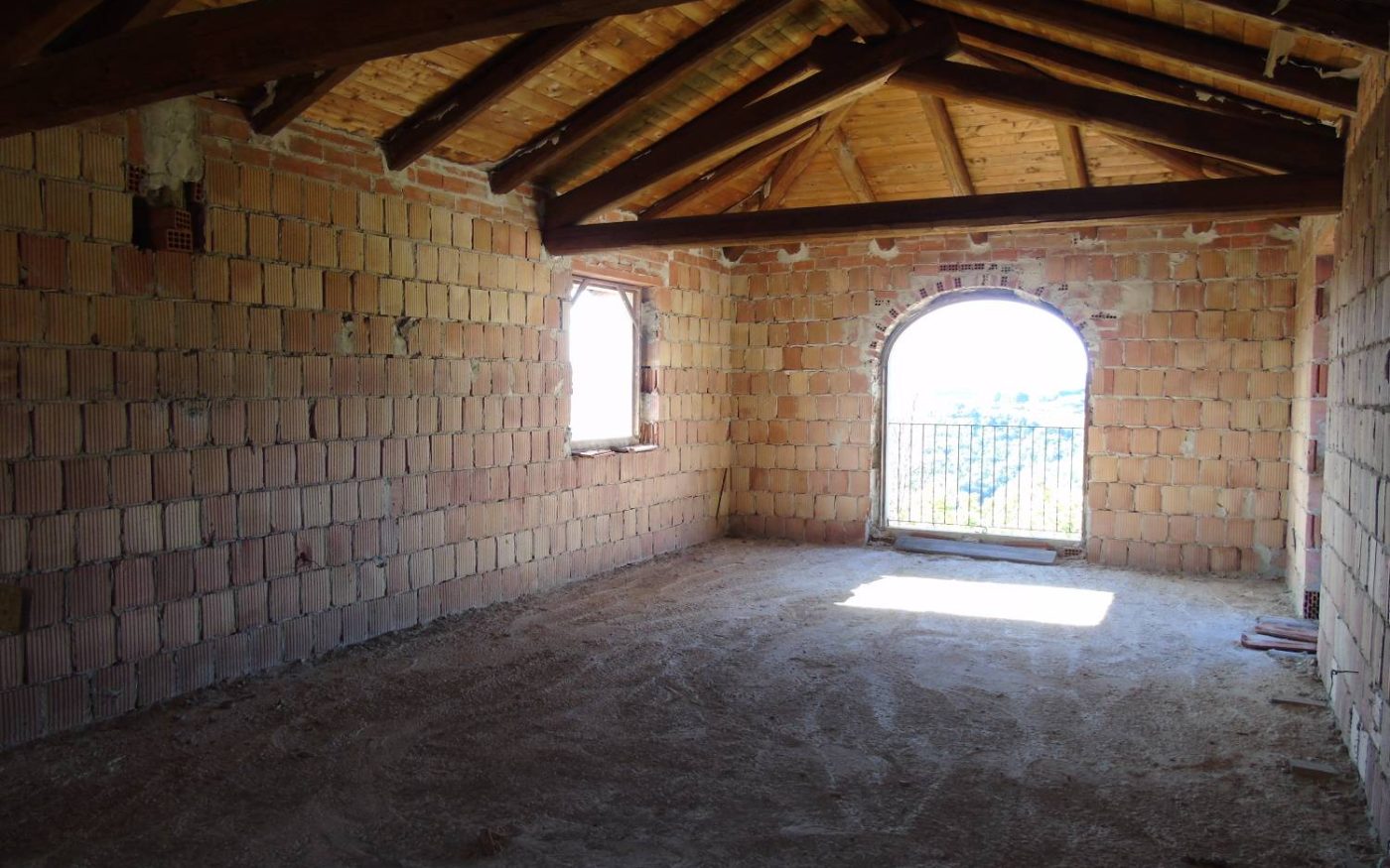 - piano superiore al quale è possibile accedere da vari ingressi, cucina, soggiorno con caminetto autentico in pietra, 5 camere e ampio vano da ultimare con tetto in travi di legno a vista.