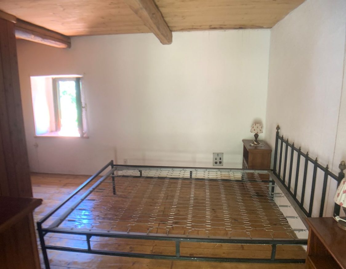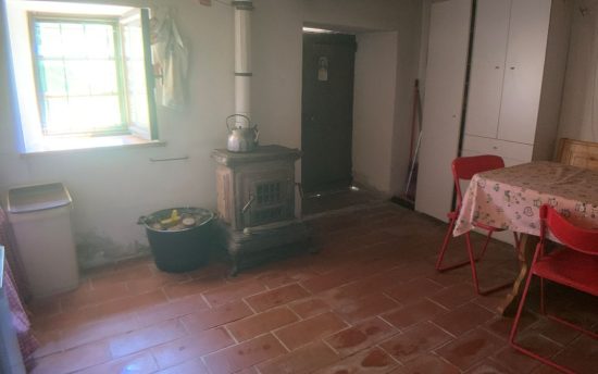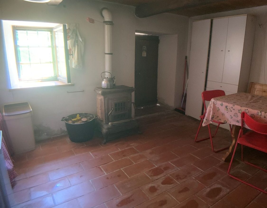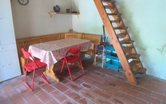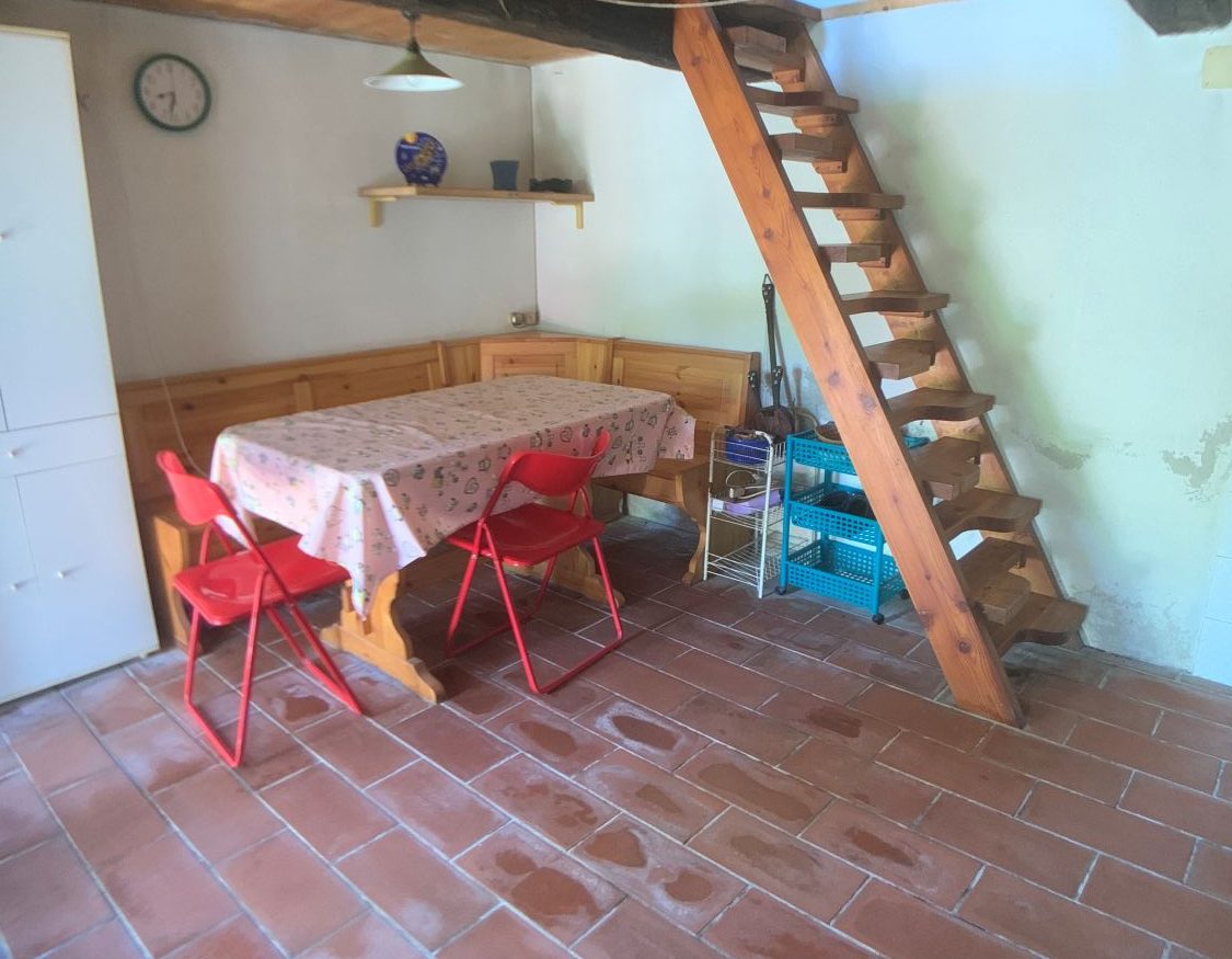 Piano terreno: ingresso, cucina con lavandino in marmo alla genovese e scala in legno per accedere ai piani superiori. All’esterno è presente un porticato laterale aperto di 13 mq.