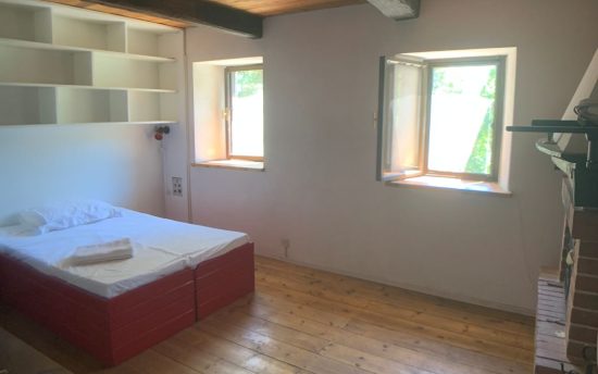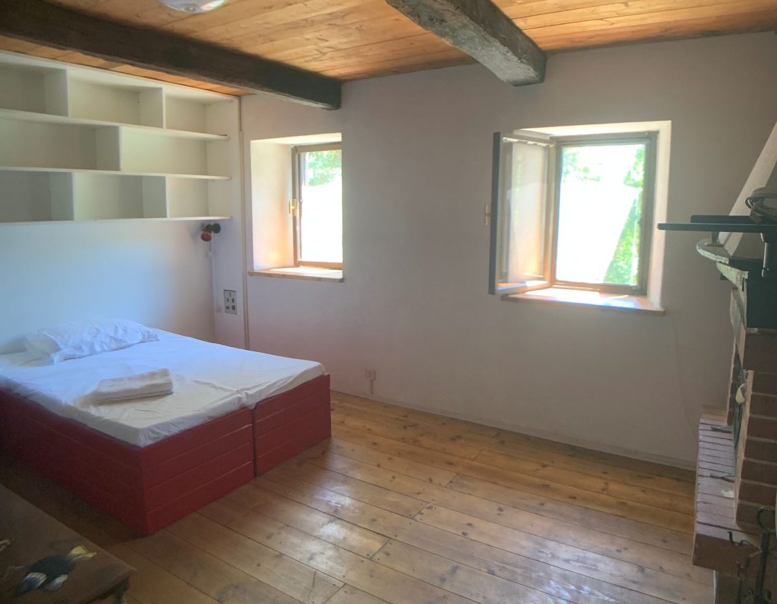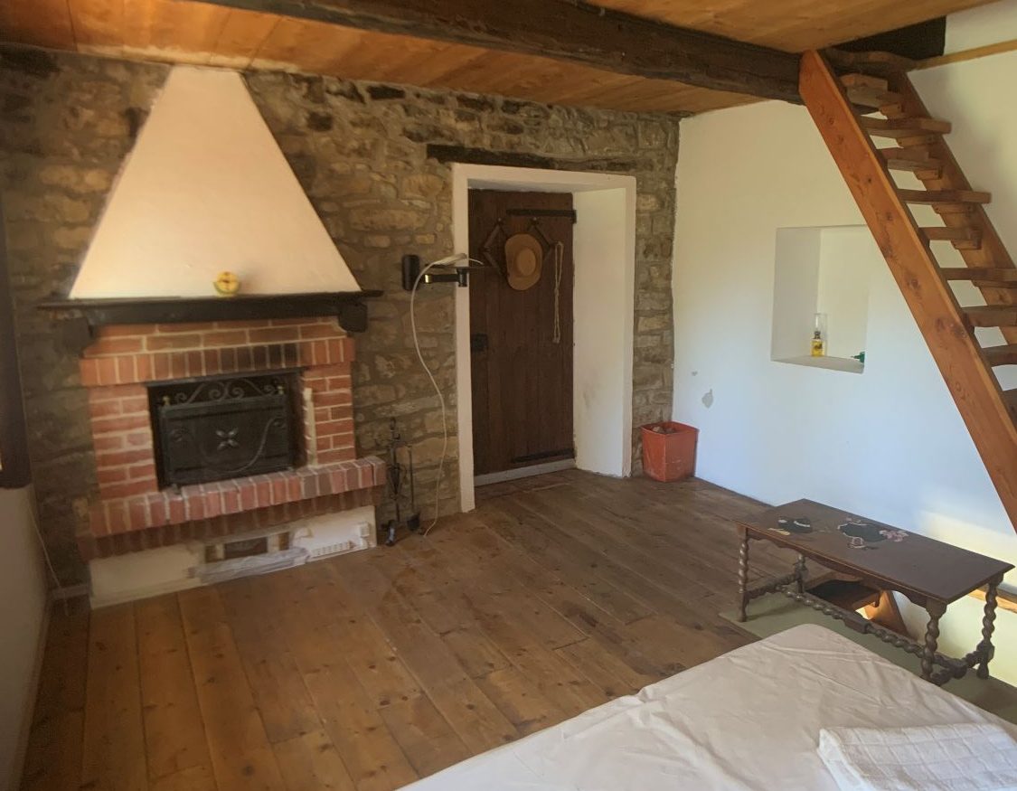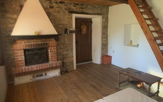 Piano primo: camera da letto con caminetto e pavimento in legno, bagno completo e scala in legno per accedere al piano superiore.